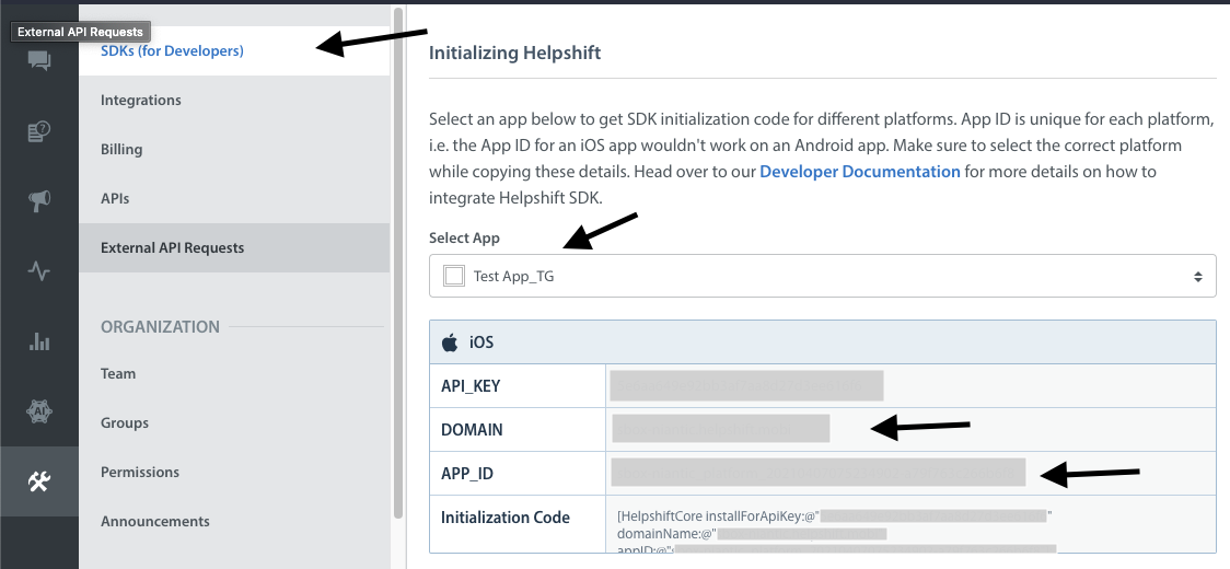 Helpshift.install(withPlatformId: "YOUR_PLATFORM_ID", domain: "YOUR_DOMAIN", config: config)
