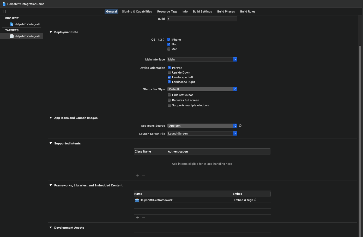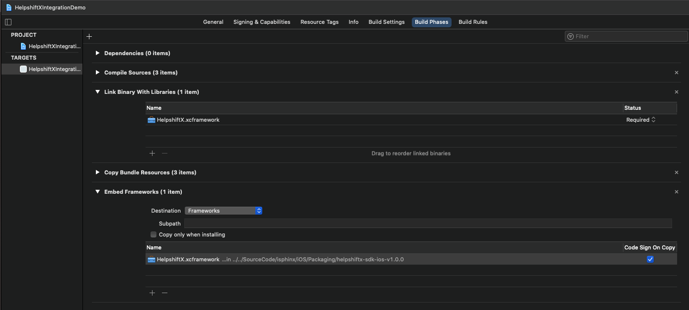 Generalsection of your app target, verify that theHelpshiftX.xcframeworkis present in theFramework, Libraries, and Embedded Contentsection with the optionEmbed and Signselected from the Embed options dropdown.